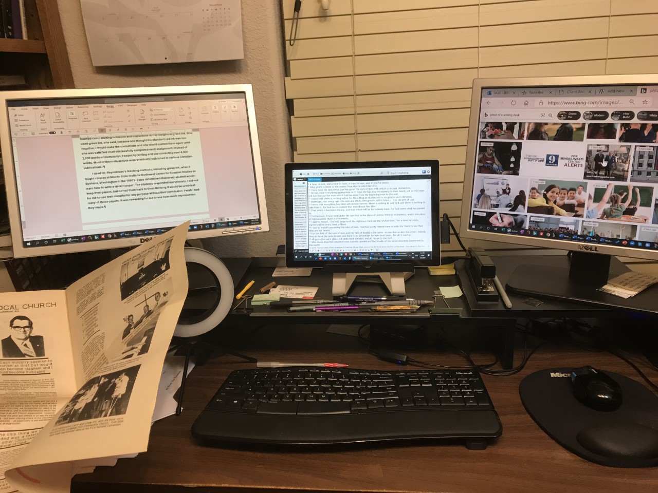 The goal of the class was for me to write 2,000 words of manuscripts of various types. I would submit my completed assignments from the previous week at the beginning of each class. She would go over the papers with a fine-toothed comb making notations and corrections in the margins in green ink. She used green ink, she said, because she thought the standard red ink was too negative. I would make the corrections and she would correct them again until she was satisfied I had successfully completed each assignment. Instead of 2,000 words, I ended by writing and her correcting over 6,000 words. Most of the manuscripts were eventually published in various Christian publications.